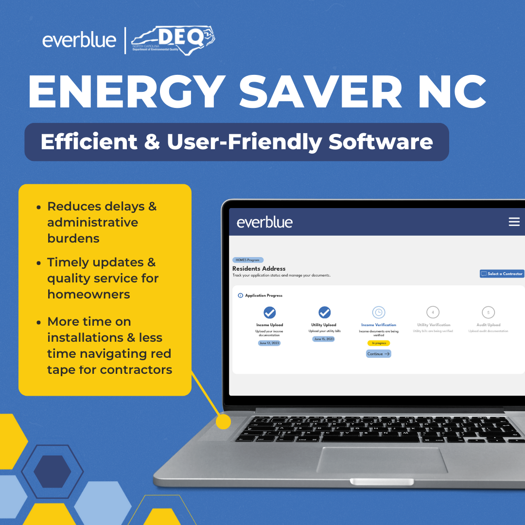 The North Carolina Department of Environmental Quality has partnered with Everblue to deliver an efficient and user-friendly experience using technology solutions and automation. Everblue is a North Carolina-based, veteran-owned company dedicated to helping government programs run more efficiently through award-winning software, hands-on implementation, and energy workforce development training. Everblue provides an online application for homeowners to apply for home energy upgrades, as well as a separate application for contractors who want to participate in the program. By using technology solutions that streamline workflows and comprehensively track tasks, decisions, and results, the program is able to: