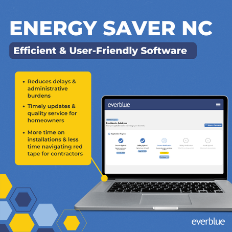 The North Carolina Department of Environmental Quality has partnered with Everblue to deliver an efficient and user-friendly experience using technology solutions and automation. Everblue is a North Carolina-based, veteran-owned company dedicated to helping government programs run more efficiently through award-winning software, hands-on implementation, and energy workforce development training. Everblue provides an online application for homeowners to apply for home energy upgrades, as well as a separate application for contractors who want to participate in the program. By using technology solutions that streamline workflows and comprehensively track tasks, decisions, and results, the program is able to: